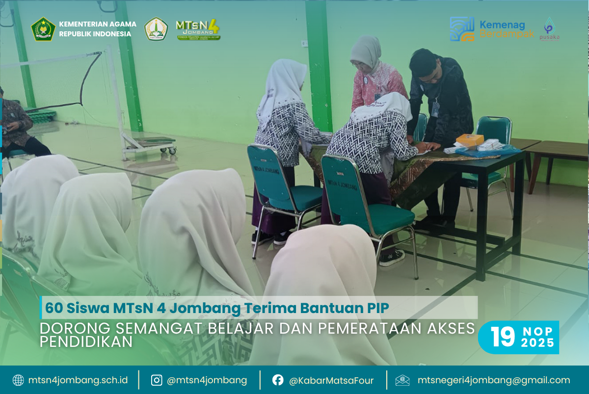 Penyaluran PIP di MTsN 4 Jombang hari ini bukan hanya seremoni pencairan dana, tetapi juga wujud komitmen madrasah dalam mendidik generasi muda dengan nilai-nilai kemandirian, tanggung jawab, dan kesungguhan belajar. Semoga bantuan ini menjadi langkah awal bagi para siswa untuk terus berprestasi serta menjadi generasi yang bermanfaat bagi agama, masyarakat, dan bangsa.