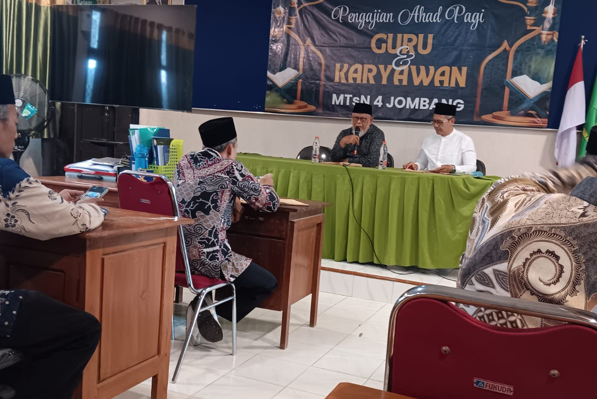 Denanyar – Pagi itu, ruang guru MTsN 4 Denanyar Jombang berubah menjadi ruang yang tak biasa. Udara Minggu pukul 07.00 WIB biasanya masih sepi, namun pagi itu justru dipenuhi oleh kekhusyukan yang jarang ditemui. Di tengah hiruk-pikuk dunia yang kian cepat, sekelompok pendidik justru memilih untuk merapat, duduk melingkar, menyelami samudera ilmu yang tak pernah kering.