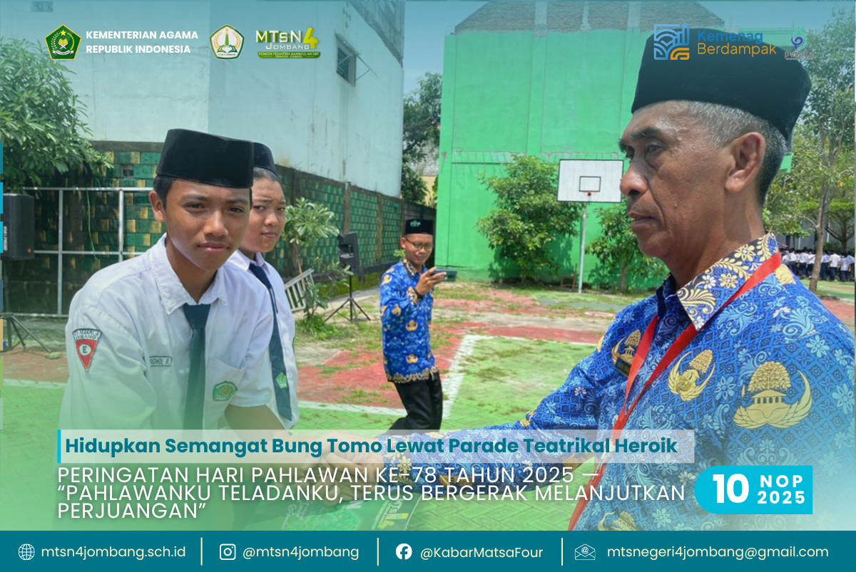Peringatan Hari Pahlawan ke-78 di MTsN 4 Jombang tahun ini menjadi bukti bahwa semangat kepahlawanan tidak pernah lekang oleh waktu. Dari upacara bendera yang khidmat, parade teatrikal yang heroik, hingga doa yang melangit, semuanya menjadi rangkaian perjalanan batin untuk meneguhkan tekad: bahwa generasi muda madrasah siap melanjutkan perjuangan para pahlawan — dengan ilmu, akhlak, dan karya nyata.