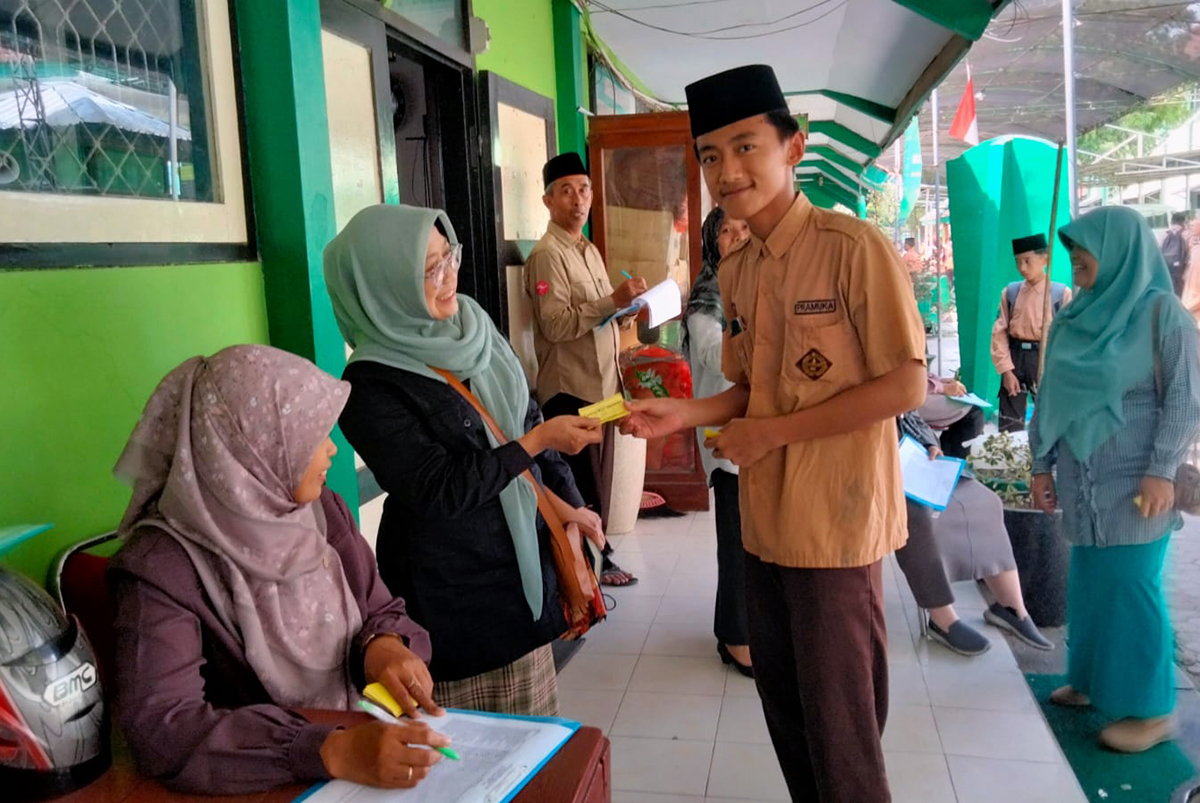 Ada satu momen yang begitu menyentuh hati dalam ritual siang ini—saat para siswa dengan penuh kesadaran menyerahkan kartu kuning mereka kepada para ibu guru yang telah setia menunggu di sepanjang teras madrasah.
