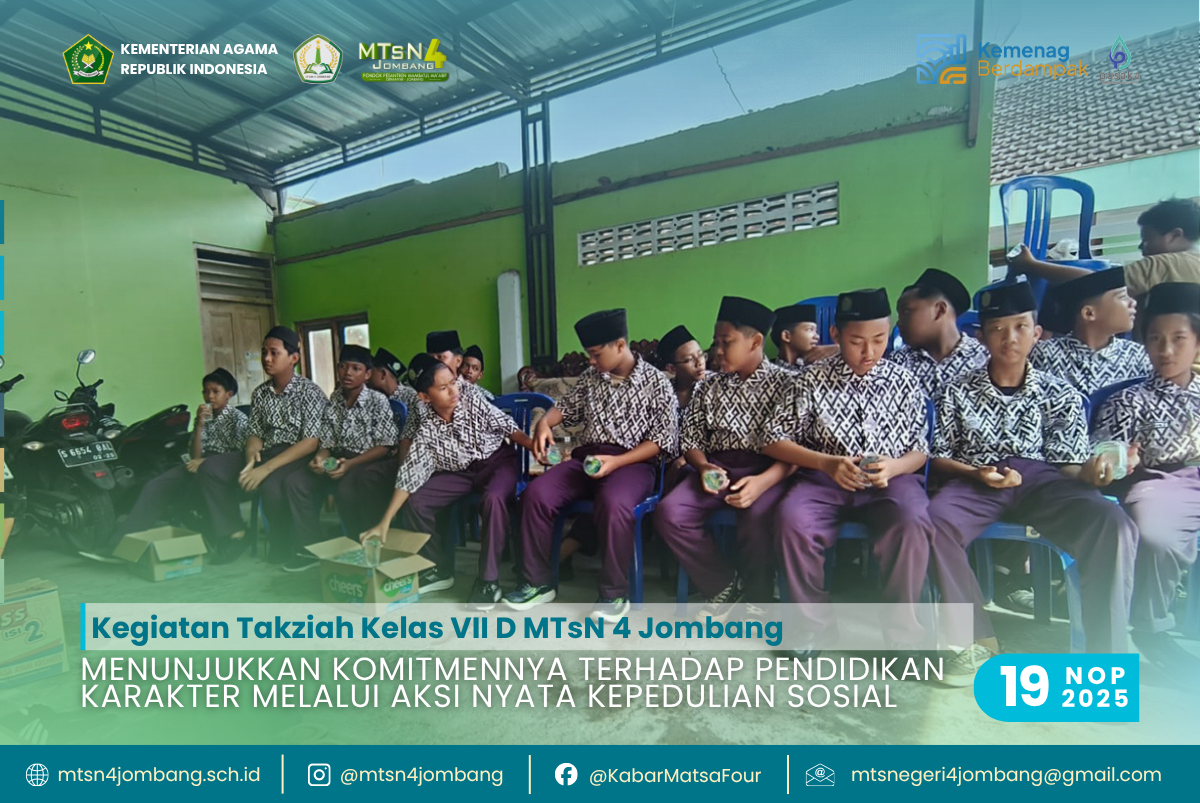 Melalui kegiatan takziah ini, MTsN 4 Jombang kembali membuktikan bahwa pendidikan bukan hanya tentang akademik, tetapi juga tentang pembentukan akhlak, empati, dan jiwa sosial. Inilah karakter unggul yang terus dipupuk di madrasah: saling menolong, saling menguatkan, dan hadir bersama saat suka maupun duka.