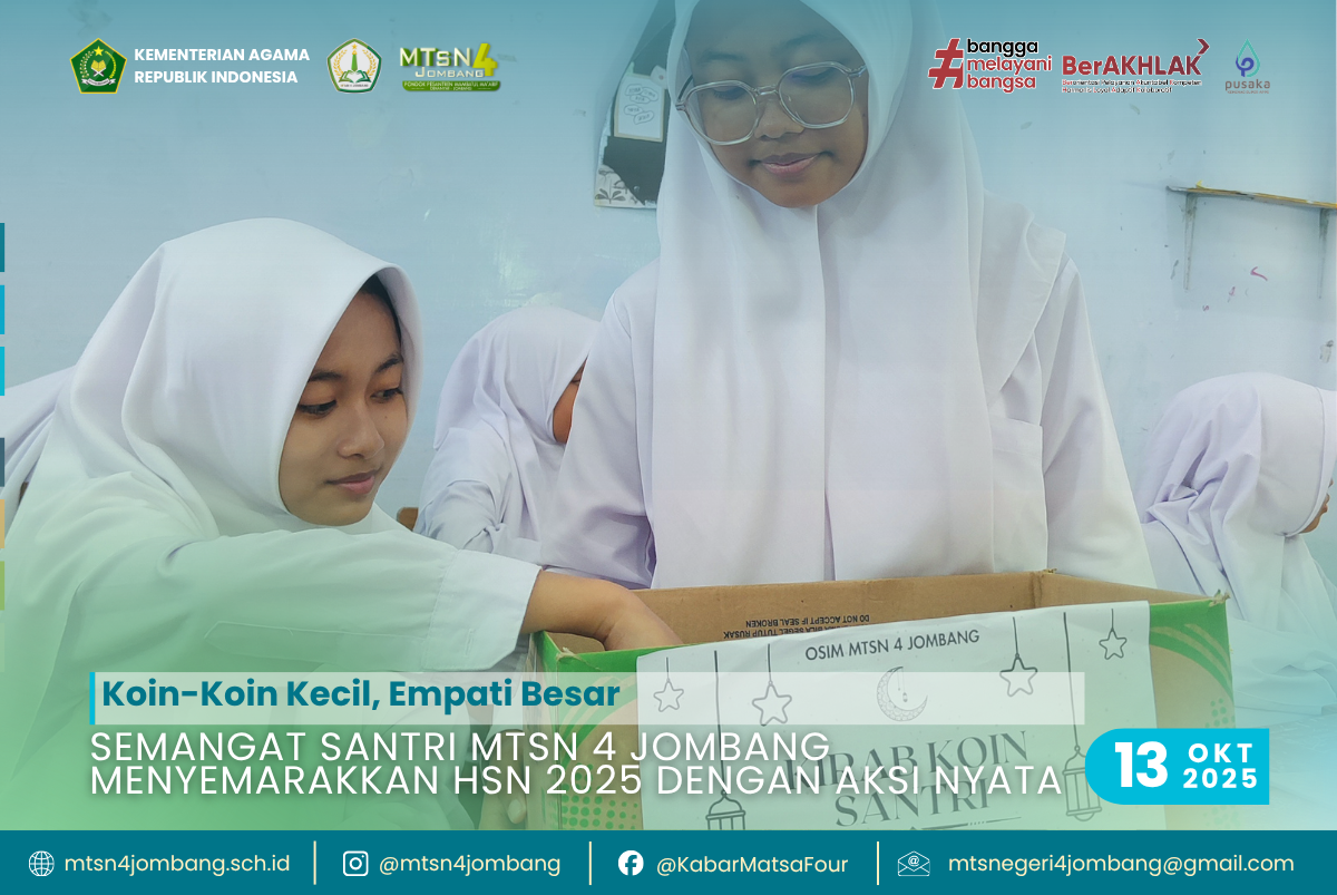 JOMBANG – Mereka mungkin masih duduk di bangku Madrasah Tsanawiyah, tetapi langkah kecil yang mereka lakukan pada Sabtu hingga Senin, 11 sd 13 Oktober 2025, membuktikan bahwa kepedulian tidak mengenal usia. Berdasarkan Surat Instruksi Yayasan Pondok Pesantren Mamba’ul Ma’arif Denanyar Jombang Nomor 1151/Ym/Ph/A.I/X/2025, seluruh siswa-siswi MTsN 4 Denanyar Jombang dengan penuh semangat terlibat dalam pengumpulan “Koin HSN 2025”.