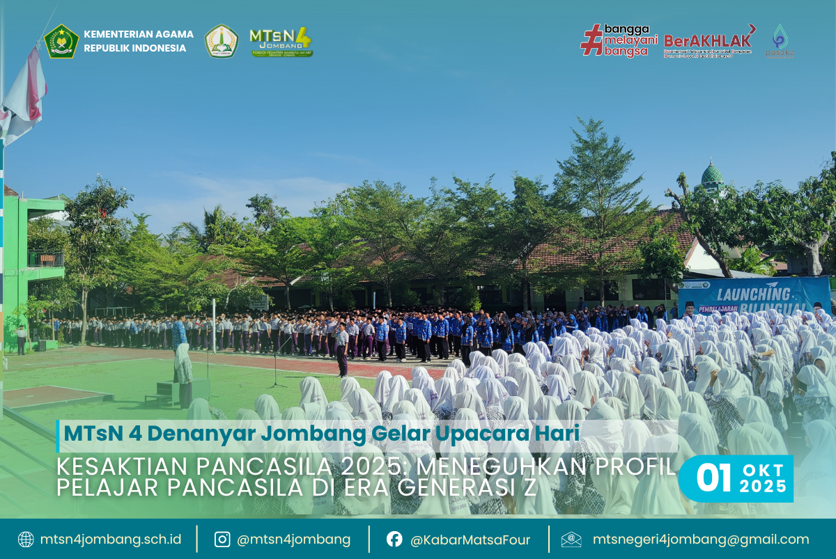 Jombang, 1 Oktober 2025 – Udara Rabu pagi terasa sejuk ketika seluruh civitas akademika MTsN 4 Denanyar Jombang berkumpul di lapangan madrasah. Dengan penuh kekhidmatan, mereka mengikuti upacara peringatan Hari Kesaktian Pancasila tahun 2025. Kegiatan ini menjadi momentum penting untuk meneguhkan kembali semangat kebangsaan, persatuan, dan kesetiaan pada nilai-nilai luhur Pancasila.
