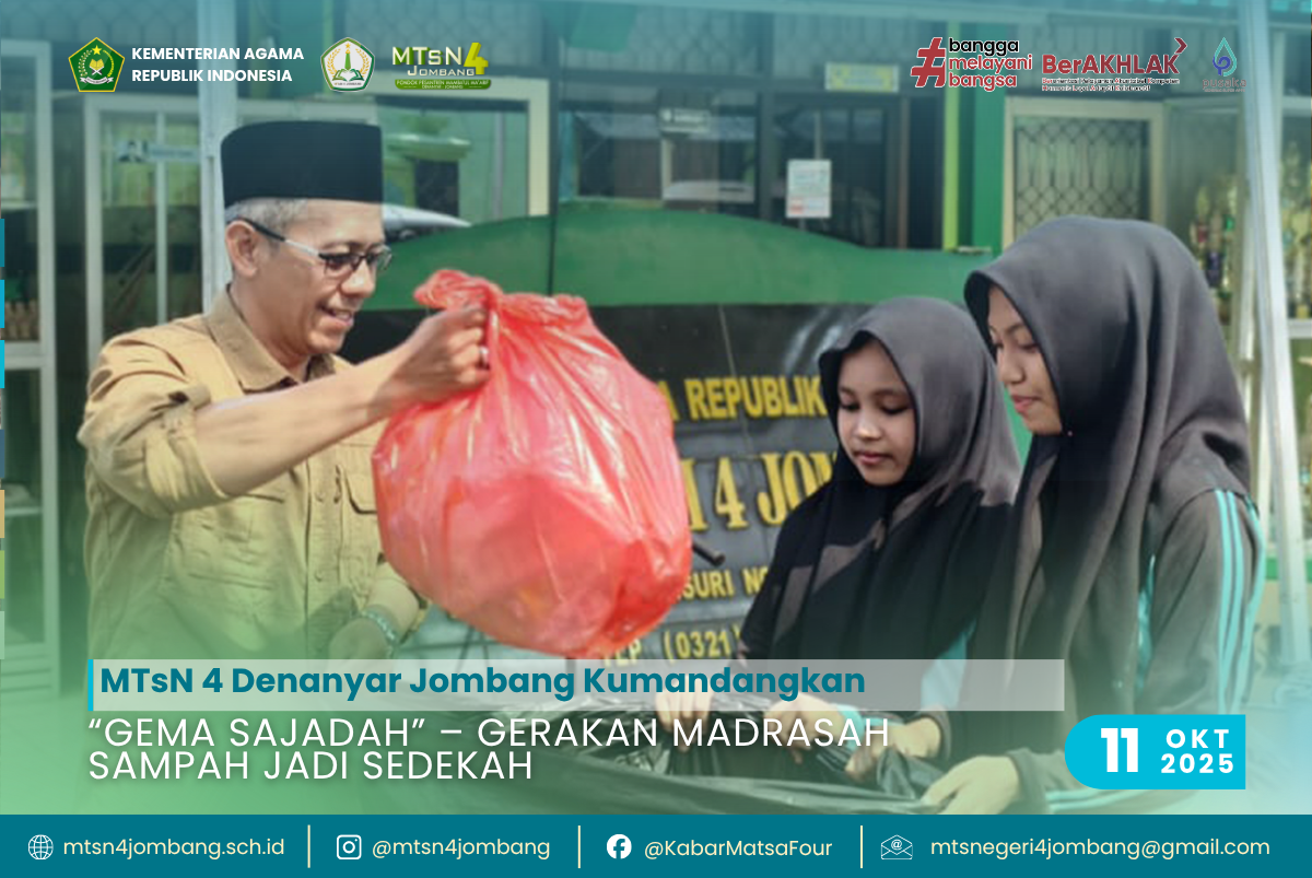 Melalui Gema Sajadah, MTsN 4 Denanyar Jombang menegaskan komitmennya untuk mewujudkan madrasah yang bersih, sehat, berwawasan lingkungan, dan menebar manfaat bagi masyarakat.
