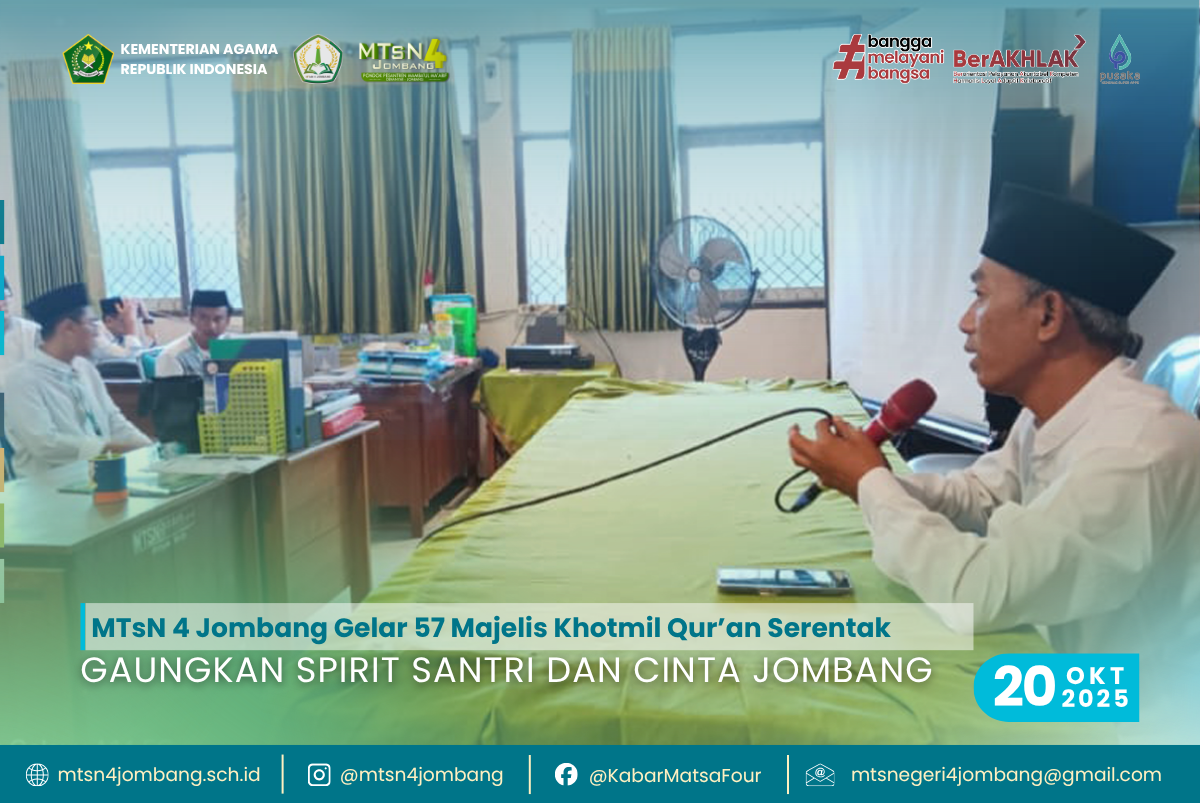 Dengan terselenggaranya 57 majelis Khotmil Qur’an di MTsN 4 Jombang, gema kalam Ilahi bukan hanya terdengar, tapi juga dirasakan sebagai getar spiritual yang menumbuhkan kedamaian, persatuan, dan cinta ilmu di hati para santri.