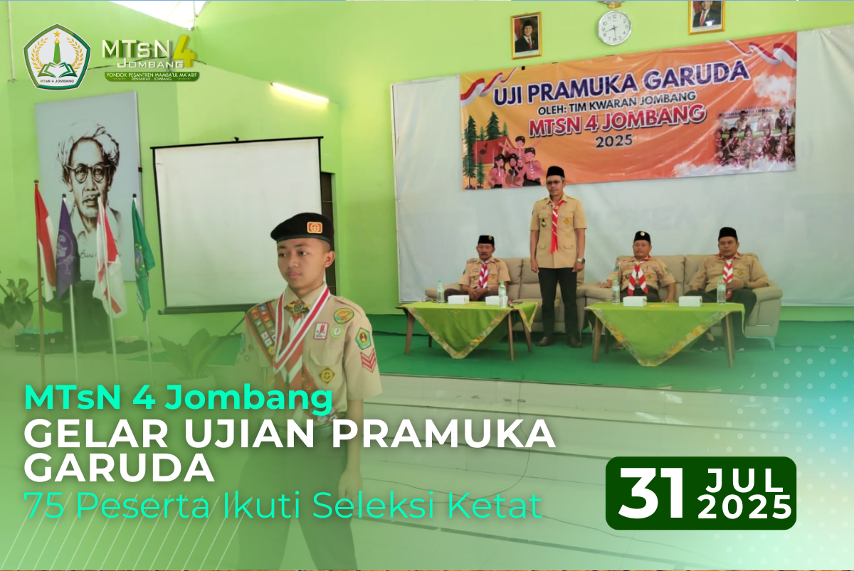 Jombang, 24 Juli 2025 – Sebanyak 75 peserta calon Pramuka Garuda dari MTsN 4 Jombang mengikuti ujian Pramuka Garuda yang diselenggarakan oleh Kwartir Cabang (Kwarcab) Jombang. Kegiatan ini berlangsung di Gedung Nur Khodijah Hasbulloh, MTsN 4 Jombang, Pondok Pesantren Mamba’ul Ma’arif Denanyar, Jombang.