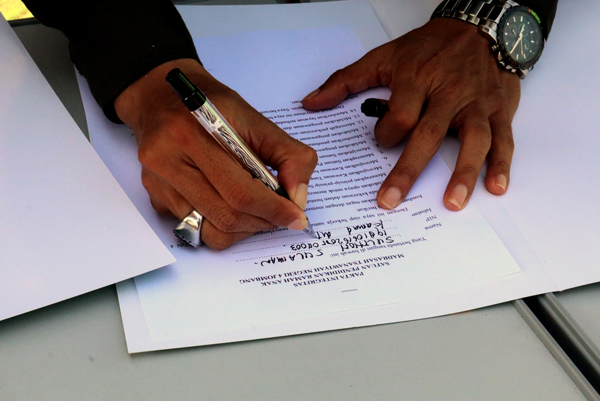 Sebagai bentuk keseriusan, seluruh tamu kehormatan, kepala madrasah se-KKM, pendidik, dan tenaga kependidikan menandatangani Naskah Komitmen Pelaksanaan SRA. Tanda tangan pada papan komitmen menjadi bukti nyata kesiapan seluruh unsur madrasah untuk menegakkan prinsip-prinsip ramah anak: menghormati hak anak, melindungi dari kekerasan, memberi kesempatan berpartisipasi, dan memastikan lingkungan belajar yang aman dan berbahagia.