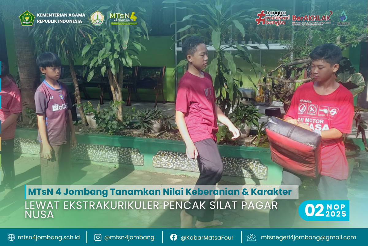 Melalui kegiatan rutin setiap Minggu pagi ini, MTsN 4 Jombang berkomitmen menjadikan pencak silat sebagai sarana pembinaan jasmani, rohani, dan karakter. Harapannya, para siswa bukan hanya tangguh di arena, tetapi juga kuat dalam iman, santun dalam perilaku, serta siap menjadi generasi penerus yang berani, berilmu, dan berakhlak mulia.