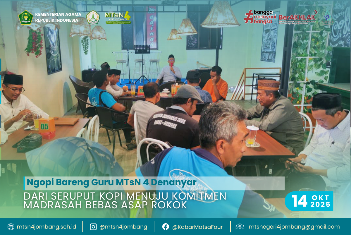 Selasa sore, 14 Oktober 2025, suasana Warung Kopi Madinah yang terletak sekitar 200 meter di selatan MTsN 4 Denanyar Jombang tampak lebih ramai dari biasanya. Aroma kopi yang khas bercampur dengan gelak tawa para guru dan tenaga kependidikan yang berkumpul dalam acara bertajuk “Ngopi Bareng Tanpa Asap” — sebuah inisiatif santai namun penuh makna untuk membahas bahaya merokok dan komitmen menuju madrasah bebas asap rokok.
