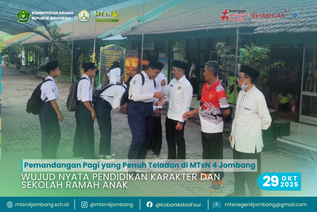 Rabu pagi, 29 Oktober 2025, MTsN 4 Pondok Pesantren Mamba’ul Ma’arif Denanyar Jombang tampak begitu hidup dan menawan. Sejak pukul 06.10 WIB, gerbang kampus sudah dipenuhi semangat dan senyum kehangatan. Bukan hanya dari para siswa yang datang dengan seragam rapi, tetapi juga dari para guru dan pimpinan madrasah yang dengan penuh keteladanan menyambut kedatangan mereka.