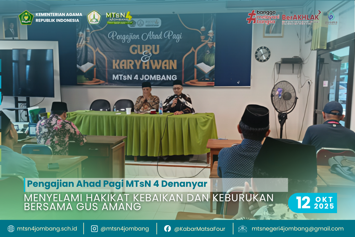 Denanyar, Jombang (12/10/2025) — Suasana ruang guru MTsN 4 Denanyar Jombang pagi ini terasa teduh dan sarat makna. Di tengah kesibukan kegiatan ekstrakurikuler siswa, para guru dan karyawan madrasah larut dalam majelis ilmu. Mereka mengikuti Pengajian Ahad Pagi Kitab Majālis As-Sāniyah karya Imam Nawawi — sebuah tradisi ilmiah yang terus dijaga di lingkungan MTsN 4 Denanyar.