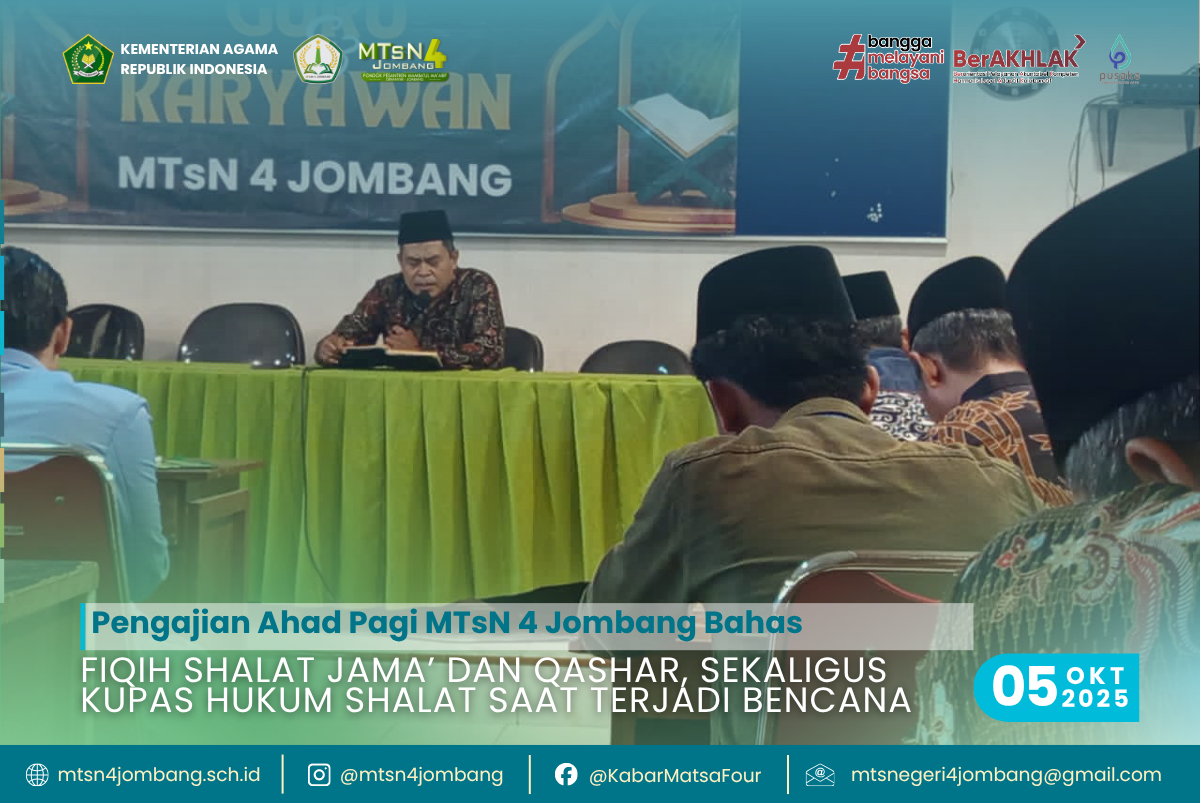 Dengan terselenggaranya pengajian ini, keluarga besar MTsN 4 Jombang terus meneguhkan diri sebagai madrasah yang berwawasan ilmu, berjiwa religius, dan tanggap terhadap realitas sosial, menjadikan setiap kegiatan keagamaan sebagai sarana memperdalam iman sekaligus memperluas pemahaman.