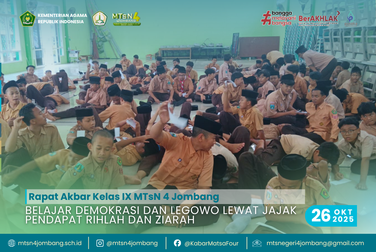 Jombang, 26 Oktober 2025 — Aula MTsN 4 Jombang terlihat ramai, Ratusan siswa kelas IX berkumpul dengan wajah antusias, penuh rasa ingin tahu dan semangat partisipatif. Bukan untuk mengikuti ujian atau lomba, melainkan untuk menggelar Rapat Akbar — sebuah forum besar yang menjadi ajang pembelajaran nyata tentang demokrasi, musyawarah, dan penghargaan terhadap perbedaan pendapat.
